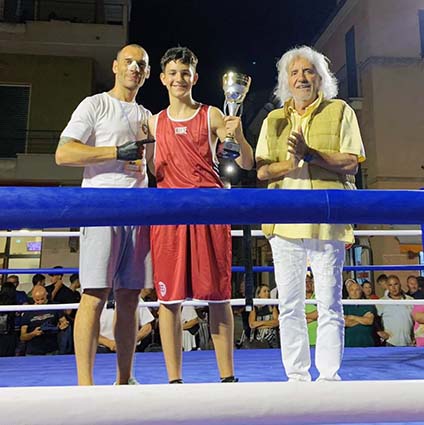 SAN BENEDETTO DEL TRONTO – La boxe è tornata in piazza a San Benedetto, grazie alla Pugilistica S22 di Francesco Novelli, Antonio Fanesi e Roberto Bassi, l’ex campione nazionale nella categoria supermedi del 2015. Il ring, con tutto il suo fascino simbolico e ancestrale, troneggiava in piazza Montebello, meglio nota ai cittadini come “piazza della verdura”, già dal primo pomeriggio. La riunione si è aperta con la presentazione del Presidente della FPI Marche, Luciano Romanella che ha ringraziato il Comune di San Benedetto del Tronto, la Pugilistica S22 e ha presentato tutti gli atleti in gara che sono saliti sul quadrato con una mano sul cuore per l’inno di Mameli di rito. I primi pugili in gara sono stati gli allievi di 12 anni del settore giovanile marchigiano di responsabilità di Francesca Pignati. Domenico Panichi della pugilistica di casa accompagnato all’angolo proprio dalla Pignati e dall’aspirante tecnico Giovanni Magliulo, contro Valerio Travaglia dell’Ascoli Boxe con all’angolo  il maestro Attilio Romanelli e l’aspirante tecnico Francesca Caputo. Match avvincente dal ritmo serrato, l’atleta Panichi chiuso e impostato già come un “picchiatore”, schivava ed entrava dentro la guardia dell’avversario con montanti e ganci in risalita, il pugile Travaglia invece, per niente intimorito, essendo più alto e longilineo lo teneva a distanza con il jab e il gioco di gambe, ad un occhio esperto sembravano già due pugili navigati nonostante la loro giovane età, purtroppo il naso un po’ debole del pugile di casa (nonostante trattasi di light boxe) che continuava a sanguinare gli ha compromesso il verdetto ma non la gloria.