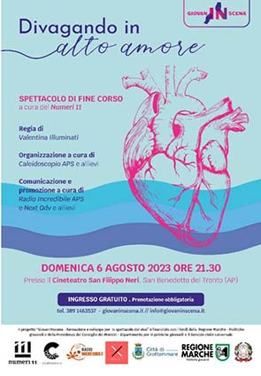 GROTTAMMARE – Appuntamento domenica 6 agosto alle ore 21.30 presso il CineTeatro San Filippo Neri di San Benedetto del Tronto con lo spettacolo gratuito “Divagando in alto amore”, l’evento conclusivo del progetto “GiovanINscena – formazione e sviluppo per lo spettacolo dal vivo” che ha coinvolto 35 giovani del territorio da febbraio ad agosto 2023. Dal palco teatrale a quello virtuale passando attraverso la radio e i linguaggi del marketing digitale e i social, i partecipanti hanno sperimentato nuovi strumenti di comunicazione supportati da professionisti dei settori coinvolti. «Giovani in scena si è confermato essere un progetto importante per i giovani del territorio – hanno detto il sindaco di Grottammare Alessandro Rocchi e la consigliera con delega alle politiche giovanili Martina Sciarroni – durante questi mesi hanno potuto toccare con mano la complessità del mondo dello spettacolo, fatto di capacità artistiche e organizzative, di passione che sposa la professionalità, di sinergie necessarie tra i diversi settori, comunicazione, organizzazione, settore artistico, che garantiscono la riuscita di un evento. Il nostro personale ringraziamento va ai ragazzi e alle ragazze che si sono impegnati in questo lungo percorso e alle associazioni che si sono occupate della formazione. Certi che si è piantato un seme che farà nascere i nuovi talenti del territorio».