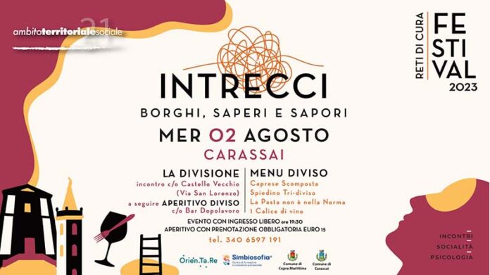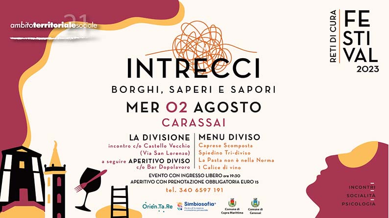 CARASSAI – Mercoledì 2 agosto, alle ore 19.30, il Castello Vecchio di Carassai (sito in via San Lorenzo) ospiterà il secondo appuntamento del 2023 dell’iniziativa “Intrecci: borghi, saperi e sapori”, organizzato dall’Ambito Territoriale Sociale 21. Questa serie di eventi si pone l’obiettivo di offrire ai partecipanti un momento di incontro dedicato alla riflessione e all’introspezione su dei temi predefiniti, ma senza vincolarli a uno specifico spaccato della sfera umana, e con il contributo di esperti e psicologi. L’appuntamento del 2 agosto avrà come tema “la divisione”, tema che sarà affrontato con il contributo del prof. Enrico Piergallini. Come lo scorso anno, l’evento è gratuito e a ingresso libero. A conclusione della parte di riflessione, seguirà un aperitivo che farà da sfondo al momento relazionale degli “Intrecci”. L’evento è il primo di una serie, al quale seguirà presto un secondo appuntamento, in un altro dei borghi che fanno parte dell’Ambito Territoriale Sociale 21. La partecipazione all’aperitivo richiede la prenotazione e un costo aggiuntivo di 15 euro.