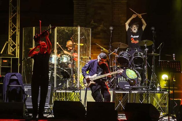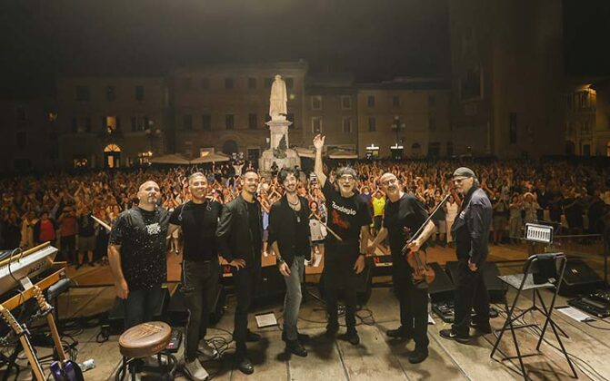 «Ogni nostra esibizione è un qualcosa fatto al momento, come dire è un piatto al dente, dipende dall’interazione con il pubblico, non c’è mai niente di riscaldato» ha detto Franz Di Cioccio (batteria e voce) tra le 100 icone della musica internazionale che insieme a Patrick Djivas (basso), Lucio Fabbri (violino, cori), Alessandro Scaglione (tastiere, cori), Marco Sfogli (chitarra, cori), Eugenio Mori (seconda batteria) ha dato vita in Piazza Giacomo Leopardi ad una nuova pagina leggendaria degli annali di Lunaria. Tra i brani offerti nella prima parte “Mondi paralleli”, “Il respiro del tempo”, “Transumanza Jam” “Impressioni di settembre”, “Dolcissima Maria” “La carrozza di Hans” “Cyber Alpha” e l’omaggio a Demetrio Stratos “Maestro della voce”.