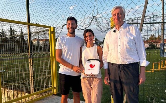 CASTEL DI LAMA – Hanno voluto condividere il clima di gioia e di amore del loro matrimonio con tutta la comunità di Castel di Lama, donando un defibrillatore al campo sportivo parrocchiale che ogni giorno accoglie decine di bambini e ragazzi e che è anche sede della squadra di calcio “Santa Maria Truentina”. Protagonisti del bel gesto di solidarietà sono due giovani sposi ascolani, Elettra e Fabrizio, che, al posto delle bomboniere, hanno deciso di acquistare e donare il prezioso strumento medico. I ragazzi, convolati a nozze il 28 luglio, hanno consegnato il defibrillatore qualche giorno prima della cerimonia insieme al presidente della Croce Verde di Ascoli Piceno, Maurizio Ramazzotti.