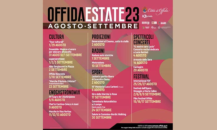 OFFIDA – Un altro fine settimana intenso a Offida, con eventi per tutti. Si parte il 4 agosto in Piazza del Popolo con “Il nostro caro Lucio”, il recital-tributo, che si forma sulle parole, le musiche e le immagini del grande Battisti. Ingresso gratuito. Il 5 e 6 agosto torna una delle sagre più antiche più antiche d’Italia, quella del Chichiripieno. La manifestazione enogastronomica giunta alla sua 54esima edizione, è organizzata dalla Pro Loco e si svolgerà in Piazza del Popolo, con inizio alle ore 18. Il 6 agosto, alle ore 19, al giardino di Casa Forlini ci sarà lo spettacolo “La Ciambella addormentata nel forno”, una rilettura molto speciale della celeberrima favola de “La Bella Addormentata nel Bosco” che, per l’occasione, va ad ambientarsi in una bottega dolciaria. Con attori e pupazzi della compagnia Nata Teatro di Arezzo. Lo spettacolo fa parte della rassegna estiva di teatro per ragazzi e famiglie “Colline a vapore” promossa dall’Unione dei Comuni della Vallata del Tronto. Il progetto è parte del circuito interregionale Marameo Festival. E ricordiamo che il 9 agosto ci sarà l’appuntamento con Chef in Cantina a 4 mani (a cura di Ophis e Blob Ristorante) presso la Tenuta La Riserva.