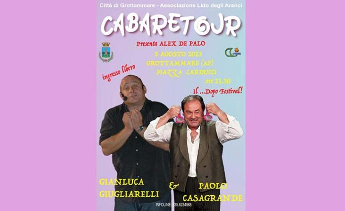 GROTTAMMARE – Domani, sabato 5 agosto si alza il sipario per “Cabaretour”, la manifestazione che fa da contorno al Festival “Cabaret Amoremio!”. Dopo il successo di “Notti Magiche”, ritorna in Piazza Carducci con il patrocinio del Comune di Grottammare, la storica Associazione grottammarese Doc Lido degli Aranci, organizzatrice per eccellenza di brillanti spettacoli di comicità. Sarà la volta di Gianluca Giugliarelli, il famoso Separato di Zelig, artista poliedrico e volto della tv nazionale.