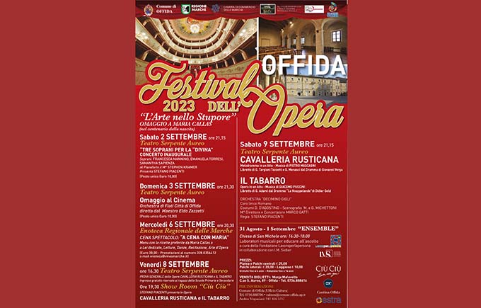 OFFIDA – Dal 2 al 9 settembre torna a Offida il Festival dell’Opera. Questa edizione 2023 tratterà l’Arte dello Stupore in omaggio al soprano Maria Callas a 100 anni dalla nascita (2 dicembre 1923) e andranno in scena “La Cavalleria Rusticana” di Pietro Mascagni e “Il Tabarro” di Giacomo Puccini. La direzione artistica del festival è a cura di Ettore Nova e Ambra Vespasiani. Si inizierà sabato 2 settembre, ore 21.15 al Teatro Serpente Aureo con il concerto inaugurale “Tre Soprani per la Divina”, con i soprani Francesca Mannino, Emanuela Torresi e Samantha Sapienza. (Posto unico, 10 euro). Domenica 3 settembre alle ore 21,30 sempre a teatro ci sarà l’evento Omaggio al Cinema a cura dell’Orchestra di Fiati Città di Offida diretta dal Maestro Eldo Zazzetti. (Posto unico, 10 euro). Il 6 settembre all’Enoteca regionale (ore 20.30) ci sarà “A cena con Maria”. I commensali potranno degustare un menu composto dalle ricette preferite della Callas o a lei dedicate. La serata sarà accompagnata da letture, danze, recitazione e arie d’opera. Per prenotazioni: 328/0356412 o tramite mail enoteca@vineamarche.it  L’8 settembre ci sarà la possibilità di assistere alla prova generale dello spettacolo, al Serpente Aureo (ore 16.30), riservata ai ragazzi delle scuole primarie che partecipano al laboratorio; mentre alle 19.30 allo Show Room di Ciù Ciù saranno presentate le due opere. Sabato 9 settembre, alle ore 21.15, andrà in scena “La Cavalleria Rusticana” e a seguire “Il Tabarro”. Sarà il Maestro Marco Gatti a dirigere l’Orchestra Decimino Gigli, e il Coro Lirico Romano, con la regia di Stefano Piacenti. Il soprano Ana Isabel Lazo interpreterà Santuzza, mentre il tenore Joan Lainez sarà Turiddu (Cavalleria Rusticana). Mentre sarà il baritono Ettore Nova vestire i panni di Michele, il giovane tenore Fabio Aureli sarà Luigi e il soprano Ana Isabel Lazo darà voce a Giorgietta e Luigi Paolillo Il Tinca ne “Il Tabarro”. Con loro in scena nelle due opere: Ambra Vespasiani, Giada Zocchi, Giada Frasconi, Danilo Paludi. I biglietti sono prenotabili e acquistabili presso Monja Shop a Offida. Tra le giornate che la città di Offida dedica alla lirica ci saranno i laboratori Ensemble – organizzati da EllePì eventi il 31 agosto e il 1 settembre nella Chiesa di San Michele – per educare all’ascolto i più piccoli.