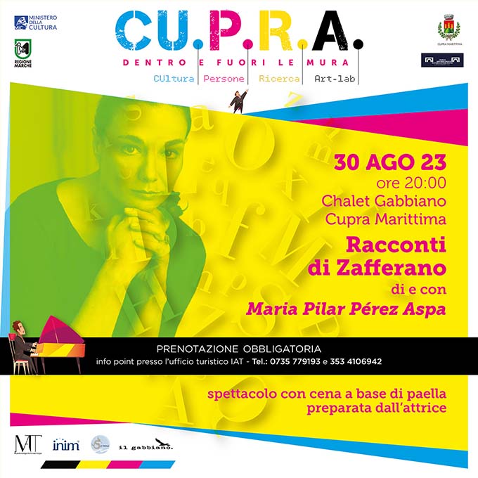 CUPRA MARITTIMA – Mercoledì 30 agosto, presso lo chalet Gabbiano di Cupra Marittima, andrà in scena “Racconti di Zafferano”, un’originale ed intensa esperienza teatrale: gli spettatori sono inviatati ad un appuntamento speciale, uno spettacolo ma anche un’occasione di degustazione culinaria in cui l’attrice Maria Pilar Pérez Aspa li accompagnerà in un viaggio attraverso il cibo, l’atto – insieme concreto e simbolico – del mangiare, la letteratura, i libri e gli autori che nel corso della storia ne hanno parlato. Si tratta dell’ultimo appuntamento stagionale del festival “Cupra Dentro e Fuori le Mura” sostenuto dall’Amministrazione comunale e diretto da Lucilio Santoni. Numero limitato di posti. Prenotazione obbligatoria. «Mangiamo e parliamo con lo stesso organo. – spiega l’attrice Maria Pilar – Cibo e parole convivono nella nostra bocca e si nutrono a vicenda. Per questo l’atto di mangiare rappresenta uno degli aspetti più evidentemente culturali nell’uomo. Ho raccolto pagine memorabili di Cervantes, Proust, Vicent, Montanari, Scarpellini, Montalbàn, Fernando de Rojas: pagine che parlano di cibo, di fame, di nutrimento, di ritualità… le ho messe assieme a tante ricette e le ho sparpagliate sulla tavola da pranzo. Così è nata questa letteratura ai fornelli, una sorta di fumetto a parole sulla storia dell’alimentazione: due pentole, un tavolo lungo, dei commensali, testi e riflessioni sull’atto di mangiare. Si cucina, si racconta, si mangia. Perché con il cibo non si gioca, ma ci si può divertire».