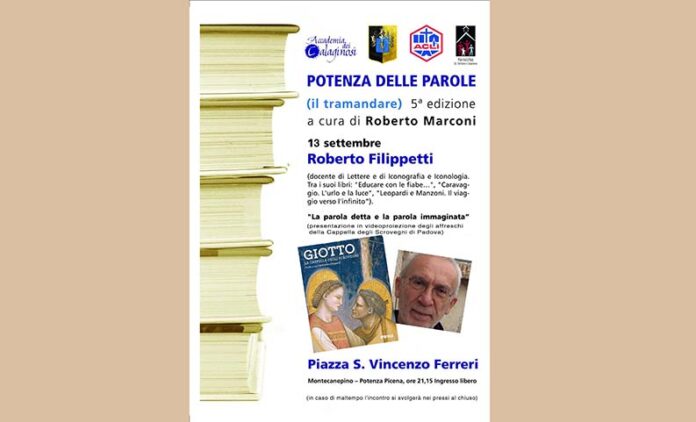 POTENZA PICENA – Dopo il grande successo di pubblico riscontrato per l’esperto di fiabe Antonio De Signoribus, mercoledì 13 settembre alle ore 21,15 presso la piazza San Vincenzo Ferreri di Montecanepino a Potenza Picena, la Rassegna “Potenza delle Parole” vedrà protagonista Roberto Filippetti il quale tramite una videoproiezione spiegherà con un linguaggio chiaro a chiunque gli affreschi della Cappella degli Scrovegni a Padova. Filippetti esperto di iconologia e iconografia cristiana, tiene ogni anno decine e decine di incontri sulla letteratura e l’arte. Molti i suoi libri in merito, tra cui “L’Avvenimento secondo Giotto” (tradotto in inglese, francese, tedesco e spagnolo), “Il Vangelo secondo Giotto”, “Caravaggio. L’urlo e la luce”, “San Francesco secondo Giotto”, “Van Gogh. Un grande fuoco nel cuore”, “Francesco secondo Giotto”, “Anche i cammelli fanno ooh!”,”Giotto. La Cappella degli Scrovegni”, “Leopardi e Manzoni. Il viaggio verso l’infinito”, “Educare con le fiabe. Andersen, Collodi, Saint-Exupéry, Lewis”. Numerose anche le esposizioni che ha curato: “Il Vangelo secondo Giotto. La cappella degli Scrovegni”, “San Francesco secondo Giotto. La vita del Santo attraverso gli affreschi della Basilica Superiore di Assisi”, “Caravaggio. L’urlo e la luce” e “Van Gogh. Un grande fuoco nel cuore” sempre per la casa editrice Itaca. L’appuntamento con Filippetti – organizzato dall’Accademia dei Calaginosi Aps, con la collaborazione dell’Acli locale e della Parrocchia dei Santi Stefano e Giacomo – è introdotto dall’ideatore e curatore della rassegna Roberto Marconi. L’ingresso è libero. Info: accademia.calaginosi@gmail.com oppure telefonare al 3296420590.