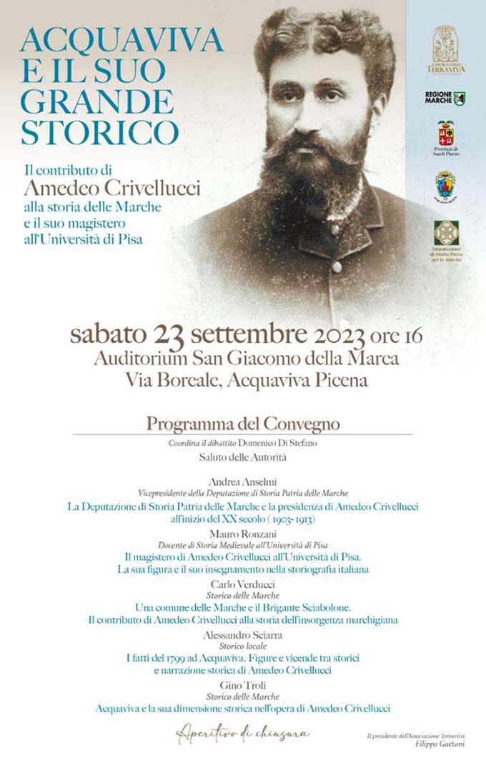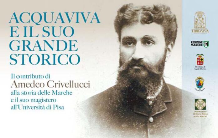 ACQUAVIVA PICENA – La figura e il magistero di Amedeo Crivellucci (1850-1914) saranno al centro di un importante convegno che si svolgerà ad Acquaviva, sabato 23 settembre alle ore 16, presso i locali dell’Auditorium San Giacomo della Marca in via Boreale con il titolo di “Acquaviva e il suo grande storico. Il contributo di Amedeo Crivellucci alla storia delle Marche e il suo magistero all’Università di Pisa”.Il convegno organizzato dall’Associazione Terraviva e patrocinato dal Comune di Acquaviva, dalla Regione Marche e dalla Provincia di Ascoli Piceno, vede anche l’alto patrocinio e la partecipazione della Deputazione di Storia Patria delle Marche.  «È un’occasione per approfondire il ruolo che questo grande personaggio della storiografia nazionale ha svolto a cavallo tra ‘800 e ‘900 nelle Marche e in Italia dove a lungo è stato uno dei massimi esponenti della nuova scuola positivistica molto attenta al ruolo dei documenti e alla ricerca. – afferma Filippo Gaetani, presidente dell’Associazione Terraviva – Allievo di Pasquale Villari e maestro di Gioacchino Volpe svolse una funzione fondamentale per lo sviluppo della disciplina storica in Italia e rimase comunque molto legato al paese natale che mise al centro di uno dei suoi saggi più importanti: “Una comune delle Marche nel 1798 e 99 e il brigante Sciabolone”(1893)».