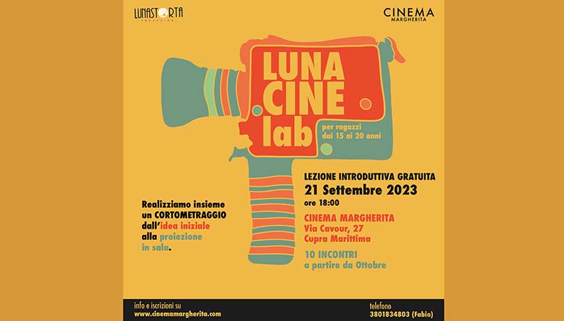 Il 21 settembre alle ore 18 verrà presentato al Cinema Margherita il nuovo corso di cinema a cura di Lunastorta Produzioni in collaborazione con il Cinema Margherita di Cupra Marittima rivolto ai ragazzi tra i 15 e i 20 anni che si avvicinano al mondo del cinema per la prima volta –