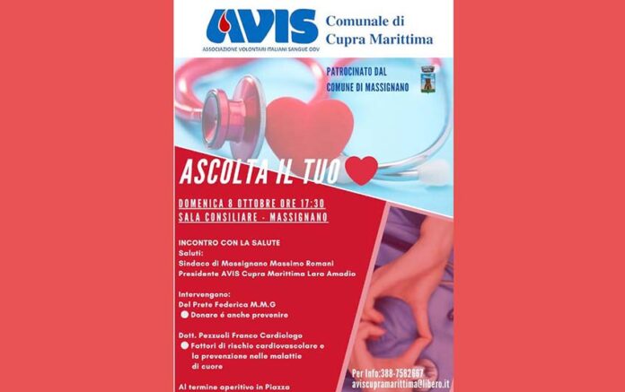 MASSIGNANO – In un’epoca in cui la salute è al centro di tutte le nostre preoccupazioni, l’Avis di Cupra Marittima si impegna a diffondere consapevolezza sulle malattie cardiache, una delle principali cause di decesso in tutto il mondo. Per far luce su questo importante argomento, l’Avis ha organizzato un evento straordinario dal titolo “Ascolta il tuo cuore”, che vedrà la partecipazione del rinomato cardiologo Franco Pezzuoli. L’evento si terrà domenica 8 ottobre alle ore 17.30, presso la Sala Consiliare del Comune di Massignano. Il dott. Pezzuoli Franco condividerà le sue esperienze per educare il pubblico sulla prevenzione delle malattie cardiache e i fattori di rischio. Ci sarà inoltre l’introduzione della dott.ssa Federica Del Prete che tratterà l’argomento “Donare è anche prevenire”. La conoscenza è la chiave per proteggere il nostro cuore, e l’Avis di Cupra Marittima è determinata a fornire a tutti gli strumenti necessari per prendersi cura della propria salute cardiaca. Al termine dell’evento informativo, l’Avis di Cupra Marittima offrirà un aperitivo a tutti i partecipanti. Questo momento di convivialità non solo permetterà ai presenti di rilassarsi e discutere ciò che hanno imparato, ma rappresenterà anche un’opportunità per rafforzare il senso di comunità e solidarietà. L’Avis di Cupra Marittima invita tutti i residenti e i visitatori interessati a partecipare a questo evento educativo e informativo. «La prevenzione è il primo passo per mantenere un cuore sano, e la conoscenza acquisita durante questo evento potrebbe fare la differenza nella vita di ognuno di noi. – spiega la presidente Lara Amadio – Inoltre, partecipando all’evento, si sosterrà il lavoro fondamentale dell’Avis nella promozione della donazione del sangue e nell’aiutare coloro che ne hanno bisogno. Per ulteriori informazioni sull’evento, contattare l’Avis di Cupra Marittima al numero 388.7582667 o via email all’indirizzo aviscupramarittima@libero.it. Unitevi a noi per un’esperienza educativa e solidale che potrebbe cambiare la tua vita. Il vostro cuore ringrazierà».
