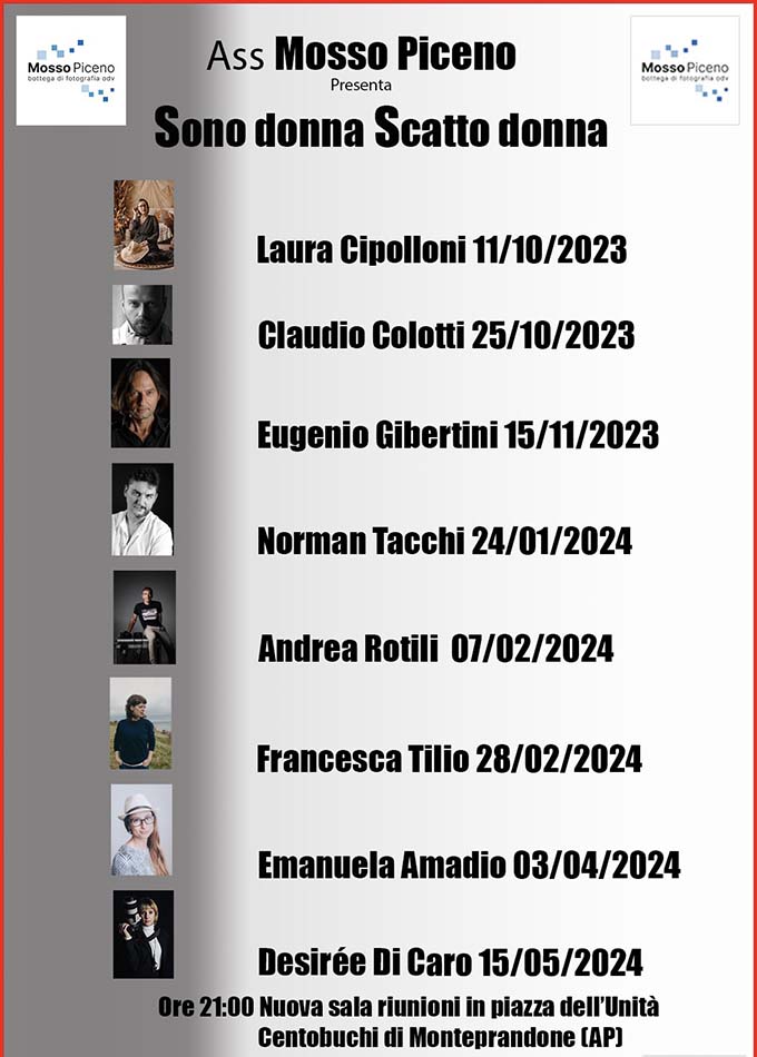 MONTEPRANDONE – Si è tenuto mercoledì 11 ottobre presso la nuova Sala Riunioni a Centobuchi di Monteprandone il primo incontro dell’evento “Sono donna. Scatto donna” una iniziativa dell’associazione Mosso Piceno Odv – La bottega di fotografia. Il primo incontro ha visto ospite la fotografa Laura Cipolloni che ha esposto, dinanzi ad un nutrito pubblico, il suo lavoro incentrato sul New Born e sulla foto di famiglia. La fotografa si è messa a disposizione delle numerose domande e delle curiosità degli intervenuti. Nel corso della serata l’Amministrazione comunale non ha fatto mancare il suo supporto con la presenza dell’assessore alla cultura Roberta Iozzi. L’associazione Mosso Piceno Odv dà appuntamento con il secondo incontro dell’evento per mercoledì 25 ottobre con Claudio Colotti.