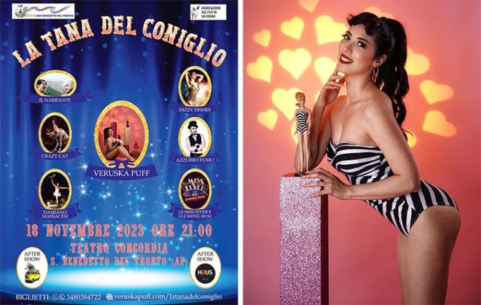 SAN BENEDETTO DEL TRONTO – Dopo aver registrato il tutto esaurito e aver riscosso un favoloso successo tra il pubblico, torna per il secondo anno consecutivo “La Tana del Coniglio”, in scena sabato 18 novembre alle ore 21 presso il Teatro Concordia di San Benedetto. Da ieri, mercoledì 18 ottobre, sono disponibili i biglietti a donazione volontaria per assistere allo show ideato e organizzato dall’International Burlesque Performer Veruska Puff che, con la sua irresistibile sensualità e un pizzico di sana ironia, ha calcato e continua a calcare i più importanti palcoscenici d’Italia e d’Europa, conquistando pubblici variegati. Anche quest’anno, il nobile fine dello spettacolo è quello di devolvere il ricavato in beneficenza alle associazioni a difesa dei conigli “Amiconiglio”, “La voce dei conigli”, “Mondo Carota”, “Pit Stop Bunny”.