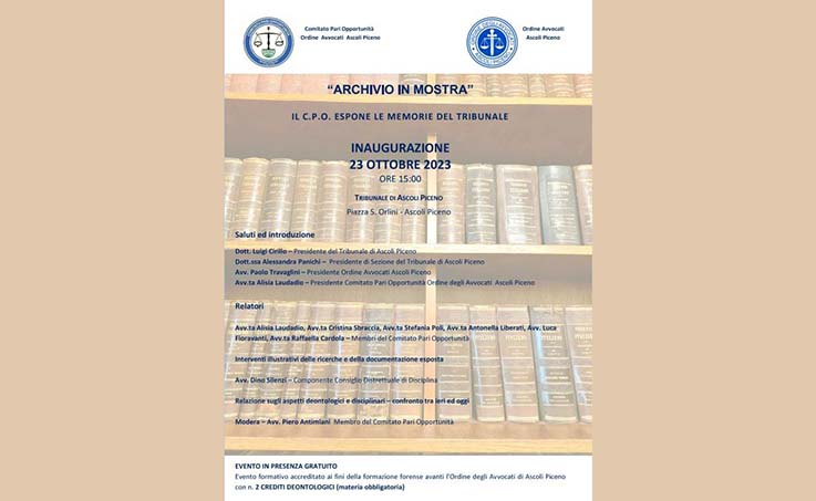 ASCOLI PICENO – Si terrà nell’atrio del Tribunale di Ascoli Piceno, lunedì 23 ottobre alle ore 15, l’evento che inaugurerà la mostra ideata e organizzata dai componenti del Comitato Pari Opportunità degli Avvocati di Ascoli Piceno Avvocati Alisia Laudadio, Cristina Sbraccia, Stefania Poli, Antonella Liberati, Raffaella Cardola, Luca Fioravanti, Piero Antimiani. «L’idea nasce dall’indagine promossa dal Consiglio Nazionale Forense sulle prime donne avvocato iscritte agli ordini professionali. Cercando nel ricco archivio del Tribunale di Ascoli le tracce delle prime colleghe iscritte, abbiamo scoperto documenti di particolare interesse storico e professionale che abbiamo pensato di condividere perché non siano dimenticati dai colleghi e possano essere conosciuti dalla collettività.» spiega la Presidente del CPO, Avvocata Alisia Laudadio. La mostra proseguirà fino al mese di dicembre. In occasione dell’inaugurazione, la documentazione esposta verrà illustrata dai componenti del Comitato Pari Opportunità e l’Avv. Dino Silenzi, componente del Consiglio Distrettuale di Disciplina, ne analizzerà gli aspetti deontologici e disciplinari. Saranno presenti all’evento il Presidente del Tribunale di Ascoli Piceno Dott. Luigi Cirillo, la Presidente di Sezione Dott.ssa Alessandra Panichi e il Presidente dell’Ordine degli Avvocati di Ascoli Avv. Paolo Travaglini.