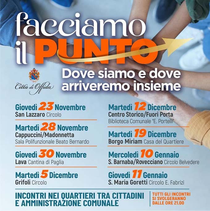 OFFIDA – Dove siamo arrivati, quali sono progetti in corso e le prospettive da costruire insieme. Questi saranno gli argomenti che verranno trattati durante gli incontri nei quartieri, tra cittadini e Amministrazione comunale, che si terranno dal 23 novembre all’11 gennaio. “Facciamo il punto”, il nome del ciclo di incontri, sarà un momento di ascolto, per recepire indicazioni, opinioni e, eventualmente, delle problematiche: per fissare un punto di arrivo e farlo coincidere con una nuova partenza. «Viviamo anni in cui spesso si parla per slogan – commenta il sindaco Luigi Massa – e di richieste che si fanno sempre più individuali. Noi vogliamo cercare di ragionare in maniera differente, in un’ottica collettiva. Crediamo a un dialogo diretto e schietto tra la comunità e chi ha il privilegio di rappresentarla. Mi auguro una bella partecipazione dei miei concittadini».