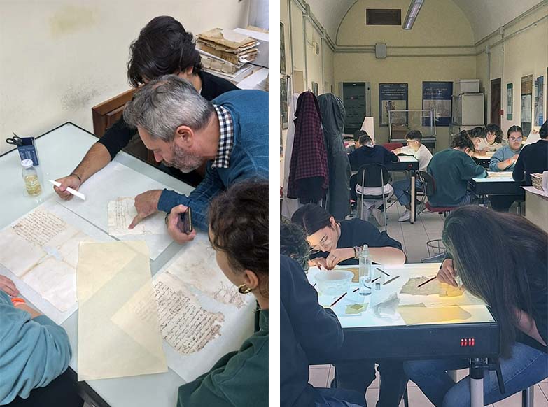 «Dallo scorso marzo 2023 infatti ben undici registri dell’Archivio Storico del Comune di San Benedetto del Tronto – datati tra la fine del XVIII secolo ed i primi anni del XIX secolo – sono stati trasferiti presso il laboratorio di restauro interno all’Archivio di Stato di Perugia per essere risanati con adeguate modalità tecniche che ne rispettino la storia e le peculiarità materiali, poiché il tempo e l’usura ne avevano compromesso l’integrità. I ragazzi hanno così avuto modo di apprendere come si affrontano nella pratica le problematiche legate agli interventi di restauro dei beni archivistici, fonti primarie in grado di raccontare la storia di chi li ha prodotti nel corso della propria attività» hanno spiegato la professoressa Simone, referente PCTO, ed il dottor Merlini.