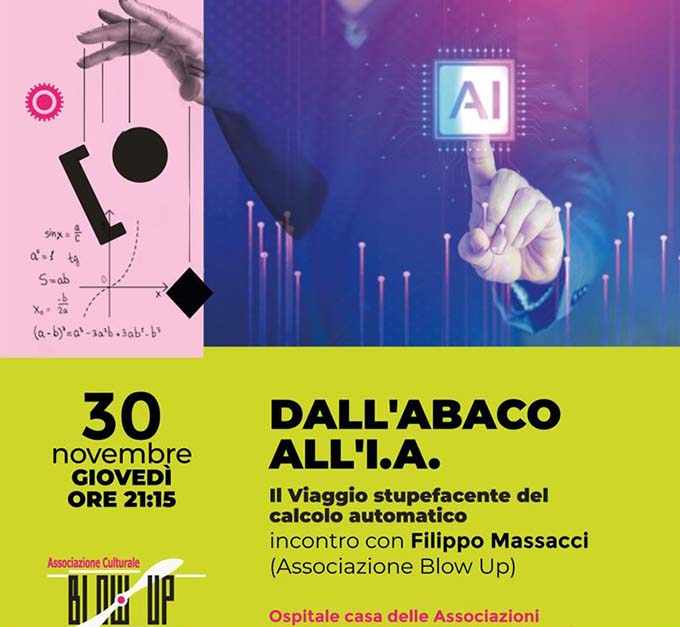 GROTTAMMARE – Nuovo evento di approfondimento per la 29esima stagione dell’associazione Blow up intitolata “Ho visto intelligenze che noi umani non potremmo immaginare.” Una stagione tutta dedicata alle molteplici forme dell’intelligenza con una attenzione particolare per l’intelligenza artificiale. Giovedì 30 novembre alle ore 21.15 presso l’Ospitale Casa delle Associazioni, a Grottammare alta, in collaborazione con l’Associazione Leggere54, ci sarà la conferenza “Dall’abaco all’I.A. – Il viaggio stupefacente del calcolo automatico”, curata da Filippo Massacci, esperto di informatica e membro del Direttivo di Blow Up. Computer, App, Social, I.A., Robot… La tecnologia informatica ha invaso la nostra vita. Come ci siamo arrivati? Sappiamo come funziona? Se sapremo usarla in modo consapevole sarà uno strumento straordinario che migliorerà le condizioni delle nostra vita altrimenti rischiamo di perdere la nostra identità e diventeremo terminazioni controllate e gestite da entità “sconosciute”. Di queste e di altre questioni si discuterà insieme al relatore. Una serata fondamentale per prendere le misure al tema centrale della stagione di Blow Up. Ingresso gratuito con tessera-abbonamento F.I.C. 2023-2024 (euro 10) sottoscrivibile nella sede di Blow Up adiacente la sala proiezioni o presso la libreria “Nave Cervo” in via Volturno a San Benedetto del Tronto. https://www.associazioneblowup.it/