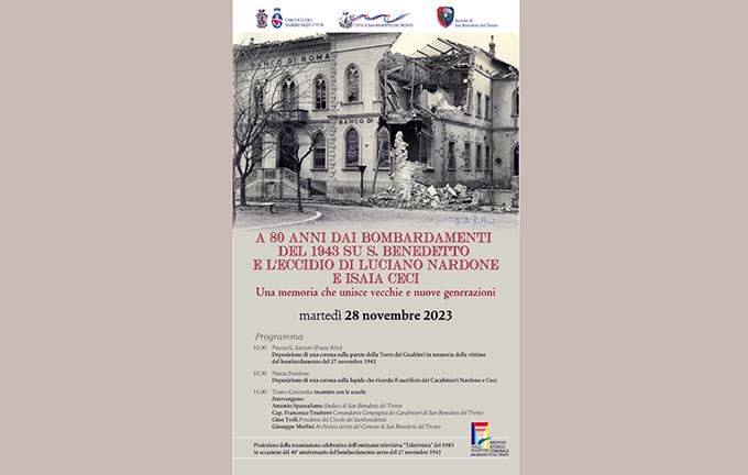 SAN BENEDETTO DEL TRONTO – Il Comune di San Benedetto del Tronto, Il Circolo dei Sambenedettesi, l’Associazione Carabinieri celebrano martedì 28 novembre gli 80 anni dal bombardamento del 27 novembre 1943 e l’eccidio del giorno successivo che vide il sacrificio del carabiniere Isaia Ceci e del maresciallo Luciano Nardone. Si tratta di due eventi strettamente legati perché senza le bombe che distrussero la città facendo ben 25 morti e tantissimi feriti, le serrande del deposito alimentare della S.A.D.A.C. non sarebbero state divelte e i nazisti non avrebbero potuto scorgere il deposito di viveri. Da qui nacque l’episodio tragico della difesa della popolazione sambenedettese da parte di Nardone e Ceci che costò la vita ai due eroi. Per ricordare i giorni della guerra, il dramma della città e la morte dei due carabinieri a cui la città ha dedicato una via ed una piazza, martedì 28 novembre alle ore 10 il sindaco Spazzafumo deporrà una corona sotto la torre del Paese Alto in memoria delle devastazioni che il vecchio incasato ebbe a causa delle bombe del 27 novembre 1943. Successivamente alle 10,30 a Piazza Nardone, presso la lapide dedicata alla morte dei due eroi, insieme al cap. Francesco Tessitore, comandante della compagnia dei Carabinieri di San Benedetto e all’Associazione ex Carabinieri, verrà apposta in memoria degli 80 anni una corona. In conclusione all’interno del Teatro Concordia, davanti ai cittadini e alle scuole, interverranno il sindaco Antonio Spazzafumo, il comandante Francesco Tessitore, l’archivista storico Giuseppe Merlini, il presidente del Circolo dei Sambenedettesi Gino Troli. Verranno proiettate immagini dei bombardamenti sulla città e le testimonianze dei sopravvissuti attraverso le interviste fatte da Gabriele Cavezzi a Telerivieranel 1983 in occasione dei 40 anni dal bombardamento.