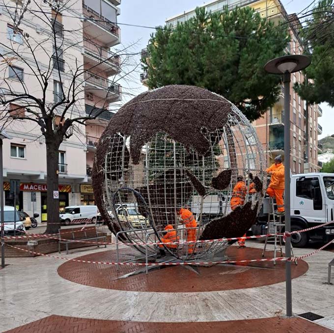 GROTTAMMARE – Per il Natale 2023, il mappamondo luminoso “DreamWorld” cambia sede: è in corso da questa mattina il montaggio della luminaria nel cuore di Zona Ascolani, in piazza Carducci. É fissata a domani, mercoledì 29 ottobre, l’accensione delle luci natalizie che accompagneranno le festività di fine anno nei principali luoghi di aggregazione cittadina. Le opere di installazione sono eseguite alla ditta MG LIGHT Srl di Giulianova (Teramo) per l’importo complessivo di 17.690 euro, a cui si aggiungono poco più di 1000 euro per la manutenzione del Mappamondo “DreamWorld”. L’affidamento riguarda i seguenti luoghi:Piazza Fazzini, Corso Mazzini e piazza Alighieri (c.d., dell’Angioletto), via Matteotti, Piazza San Pio, Piazza Kursaal, Piazza Peretti, Piazza Madonna della Speranza, Piazza Stazione, Piazza Gran Madre di Dio, Piazza Carducci, via Alighieri, Statale 16 sud (incrocio via Alighieri/via Firenze), quartiere Tesino Village. Alcuni elementi saranno posizionati ad integrazione di strutture già presenti, altri andranno a valorizzare in particolare gli arredi verdi. Con i suoi 5 metri di diametro e oltre 10mila luci a led che delineano i mari e i continenti del pianeta, il Mappamondo “DreamWorld” è una vera e propria scultura luminosa, di grande attrazione turistica e social. Realizzato su idea dell’associazione 43° Parallelo Italy nel 2019, da sempre ha accompagnato le festività natalizie illuminando piazza Kursaal. In vista della ricollocazione, il Mappamondo è stato recentemente oggetto di manutenzione. La nuova destinazione intende valorizzare il quartiere più a sud della città. «Un segnale di vicinanza a un quartiere periferico ma densamente popolato – ha dichiarato l’assessore alla Cura del Territorio, Bruno Talamonti – Il mappamondo ha riscosso da sempre l’apprezzamento di cittadini e turisti. Siamo certi che questa scelta avrà ricadute positive per la vitalità dell’intero quartiere. Per i non residenti, sarà un’occasione per frequentarlo durante le feste di fine anno».