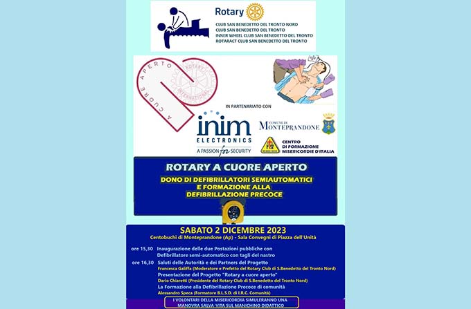 MONTEPRANDONE – Due nuove postazioni per la defibrillazione precoce a Monteprandone. Saranno inaugurate sabato 2 dicembre, alle ore 15,30, e la presentazione avrà luogo nella Sala Convegni di Piazza dell’Unità di Centobuchi. Prosegue con entusiasmo il progetto “Rotary a cuore aperto” – promosso dal Rotary Club San Benedetto Nord unitamente al Rotary Club San Benedetto del Tronto, all’Inner Wheel Club San Benedetto del Tronto e al Rotaract Club San Benedetto del Tronto – che si prefigge il prezioso scopo di dotare l’intero territorio di numerosi dispositivi “salva-vita” e di cittadini in grado di usarli correttamente. A tale fine, grazie al dono dei defibrillatori semiautomatici e ai corsi di formazioni per il loro corretto utilizzo, organizzati dal Centro di Formazione Misericordie d’Italia, da parecchi mesi ormai, da quando cioè il progetto è stato avviato, sono ormai numerose le postazioni dislocate lungo la Riviera e non solo, così come sempre più numerose fasce di popolazione hanno partecipato ai corsi di formazione per l’utilizzo corretto degli strumenti. Superfluo sottolineare l’importanza di tutto ciò, considerato che la tempestività dei soccorsi, in caso di arresto cardiaco, anche nell’ordine di pochissimi minuti, segna la differenza tra “salvarsi” e “non farcela”. Sabato prossimo, dunque, due nuovi defibrillatori, in partenariato con la Ditta “Inim electronics”, il Comune di Monteprandone e il Centro di Formazione Misericordie d’Italia, saranno posizionati nel ridente borgo Piceno dove, alle ore 15,30, avverrà l’inaugurazione con il consueto taglio del nastro. A seguire, i saluti delle autorità e dei partners del progetto. In particolare, con la moderazione di Francesca Galiffa, prefetto del Rotary Club San Benedetto Nord, il Presidente del Rotary Club San Benedetto Nord, Dario Chiaretti, illustrerà il progetto “Rotary a cuore aperto” e, a seguire, il past president nonché governatore della locale Misericordia, Alessandro Speca, riferirà su “La formazione alla defibrillazione precoce di comunità”. Al termine, i volontari della Misericordia simuleranno una manovra salva-vita sul manichino didattico. L’invito è dunque quello di partecipare numerosi all’iniziativa.