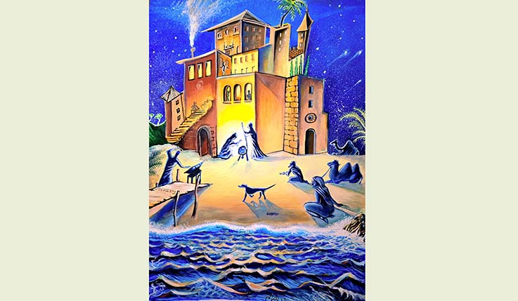 GROTTAMMARE – Porta la firma del giovane artista grottammarese Donato Gentili il dipinto che accompagnerà la locandina del Presepe Vivente di Grottammare. «Nell’opera pittorica che, come di consueto, ho realizzato per la locandina dell’evento dell’Associazione Presepe Vivente di Grottammare – spiega Gentili – ho immaginato e realizzato una luminosa natività in spiaggia con alle spalle un’architettura ideale e fiabesca che cita il Vecchio Incasato di Grottammare in alcuni particolari immersa in un cielo stellato e sereno. Tra le varie figure che di notte accolgono e ricevono l’irradiante Cristo, ho voluto inserire in primo piano sulla sinistra la figura del “coniatore di monete” che si ispira all’amico scomparso Paolo Rosati e al “mestiere” che fu suo durante la rappresentazione del Presepe, un omaggio dovuto ad una delle colonne portanti del Presepe Vivente di Grottammare. L’atmosfera dell’ opera pittorica é mediterranea e orientale allo stesso tempo, l’occhio del fruitore é portato tramite delle linee forza a convergere verso il centro della composizione dove campeggia l’accecante natività».