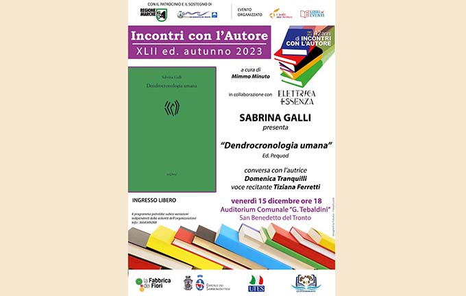 SAN BENEDETTO DEL TRONTO – Sabrina Galli presenta il libro “Dendrocronologia umana”, venerdi 15 dicembre alle ore 18, all’Auditorium Comunale “Tebaldini”. Conversa con la scrittrice Mimma Tranquilli, voce recitante Tiziana Ferretti. «Ho scritto questa nuova silloge poetica – spiega l’autrice – con l’intento di offrirla al lettore, affinché diventi una lente di ingrandimento per sguardi attenti, curiosi, desiderosi di codificare il significato salvifico della poesia, nel quale si specchia la quotidianità di ognuno di noi. “Dendrocronologia umana” vuole interagire con “l’altro”, con “il prossimo”, vuole essere semplicemente la poesia di “tutti”».