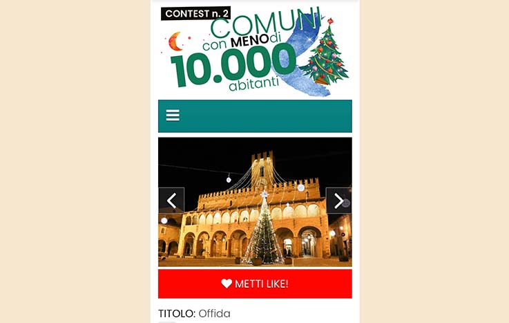 OFFIDA – Una straordinaria risposta di comunità e non solo, a sostegno di Offida che ha preso parte con il proprio albero di Natale, al contest Natalizio ideato e organizzato da Dubbing Marche – La Voce delle Marche. Il progetto, patrocinato dalla Riviera del Conero e sostenuto dalla Regione Marche, coinvolge i comuni della Regione, sopra e sotto i 10.000 abitanti aderenti all’iniziativa. Un gioco interattivo all’interno del sito www.dubbingmarche.it permette di votare e sostenere con un semplice like, il Miglior Albero di Natale. Il contest, attivo dall’11 dicembre terminerà alle ore 24 del 25 dicembre ha anche uno sfondo benefico. Parte dei contributi offerti dai Comuni aderenti saranno infatti devoluti in beneficenza alla Protezione Civile della Regione Marche sotto forma di attrezzature. «Mi rivolgo a quanti non hanno ancora votato – così commenta l’assessore al turismo Cristina Capriotti – chiedendo un sostegno collettivo anche ai borghi limitrofi. La comunità Offidana da subito, in modo attivo ed entusiasta, ha supportato l’iniziativa e di questo siamo molto felici. C’è bisogno dell’aiuto di tutti e mi auguro che si continui a votare. La modalità è semplice e non richiede registrazioni: è sufficiente visitare il sito www.dubbingmarche.it, cliccare il contest n 2 e votare lasciando un like sopra la foto del Comune di Offida scattata per noi da Marco Cicconi, che ringrazio. Votate e fate votare!».