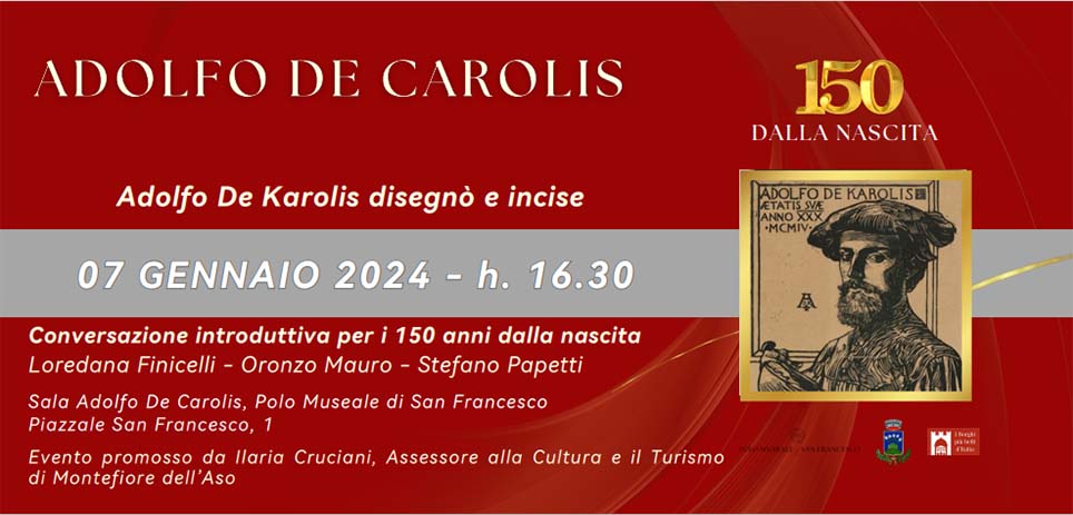 MONTEFIORE DELL’ASO – Per celebrare la nascita del maestro Adolfo De Carolis, 150 anni nel 2024, l’Amministrazione comunale di Montefiore dell’Aso promuove un incontro che si terrà domenica 7 gennaio alle ore 16.30 presso il Polo Museale di San Francesco, sede della Sala a lui dedicata. Nella Sala De Carolis sono esposti i bozzetti disegnati e dipinti dall’Artista, che vinse il grande concorso per la realizzazione del Salone dei Quattromila di Bologna. Negli anni ’50, il prof. Francesco Egidi, ideatore e promotore della raccolta De Carolis, fu il primo fra tutti i sindaci e cittadini del paese a portare De Carolis al centro della nostra cultura locale, determinando una continuità amministrativa che arriva fino all’attuale sindaco Lucio Porrà, a cui si devono i più consistenti progetti di restauro e tutela delle opere e di tutte le collezioni. L’incontro del 7 gennaio, primo di una serie di convegni che si realizzeranno nell’anno 2024, avverrà con una conversazione introduttiva che vedrà confrontarsi tre personalità di prestigio del panorama accademico e culturale nazionale: Loredana Finicelli, Oronzo Mauro e Stefano Papetti. L’idea è di mettere in luce le caratteristiche storiche, artistiche e profondamente attuali di De Carolis, un artista