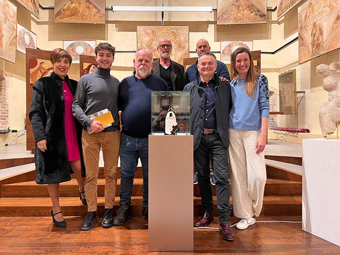 MONTEFIORE DELL’ASO – Il 30 dicembre si è tenuto a Montefiore dell’Aso, nella splendida cornice della Sala Museo Adolfo de Carolis presso il Polo di San Francesco, un momento di speciale condivisione e valorizzazione del territorio. Vino e Arte, per gli amanti della combinazione sapiente tra sapore, conoscenza e arti creative. Il pittore e artista materico Sandro Cianni ha disegnato e modellato una bottiglia Magnum del prodotto vinicolo Gromonte dell’azienda Adelino Porrà. Un unicum artistico che realizza la qualità del vino conservato e lasciato maturare in grotta attraverso la combinazione di elementi di micro-scultura. Sandro Cianni richiama il vento, che respira naturalmente nell’anfratto sotterraneo di Montefiore e compone le gocce di pioggia, rendendo essenziale il concetto di umidità, condizione naturale di bilanciamento dei valori. Questo piccolo capolavoro figurativo, si è combinato perfettamente al racconto di Adelino Porrà e del figlio Federico, di tradizione