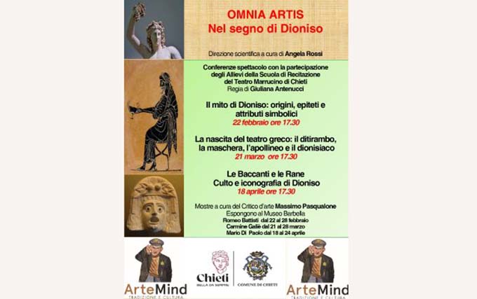 CHIETI – L’Associazione ArteMind organizza la manifestazione Omnia Artis, Patrocinata dal Comune di Chieti con direzione scientifica di Angela Rossi. Sono previsti tre incontri mensili nel Museo Barbella, in cui verrà dedicato uno spazio culturale intitolato “Nel segno di Dioniso” con presentazione della Rivista di letteratura e didattica greca Scholia e approfondimenti sul mito di Dioniso e la relativa nascita del teatro greco. Saranno presenti gli Allievi della Scuola del Teatro Marrucino con la regia di Giuliana Antenucci per conferenze spettacolo. Saranno allestite tre mostre a cura del Critico d’arte Massimo Pasqualone. Omnia Artis è un progetto culturale, che vuole mettere insieme tutti gli aspetti dell’arte: pittura, scultura, scrittura, musica, recitazione, letteratura, perché “L’opera d’arte è un messaggio fondamentalmente ambiguo, una pluralità di significati, che convivono in un solo significante” (Umberto Eco).