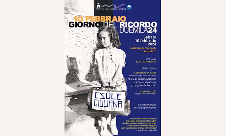 SAN BENEDETTO DEL TRONTO –  Sabato 10 febbraio l’Amministrazione comunale di San Benedetto del Tronto celebrerà il Giorno del Ricordo, istituito con la legge n. 92 del 30 marzo 2004 per commemorare le vittime dei massacri delle foibe e dell’esodo giuliano-dalmata.  Alle ore 10.30, l’Auditorium comunale “Giovanni Tebaldini” ospiterà l’incontro pubblico nel corso del quale Costantino Di Sante, professore dell’Università degli Studi del Molise, interverrà sul tema “L’esodo giuliano dalmata e i centri di raccolta profughi nelle Marche”. Il prof. Di Sante illustrerà le vicende storiche che mettono in relazione l’esodo della popolazione giuliano-dalmata dai territori d’oltremare e le terre delle Marche che accolsero i transfughi. L’evento sarà arricchito dalla partecipazione di Adele Marcelli, profuga istriano dalmata, che porterà la propria testimonianza di protagonista, suo malgrado, di quel doloroso esodo dalle terre natie.  L’evento, che vedrà la partecipazione degli studenti degli istituti superiori della città, è aperto a tutti i cittadini. «Ricordare la nostra storia – dice l’assessore alla Cultura Lia Sebastiani – è una necessità che oggi si sente più forte che mai alla luce delle vicende geopolitiche che stanno sconvolgendo il nostro presente. Le scene a cui assistiamo sui telegiornali, le immagini condivise via internet e le notizie dei conflitti in corso in Ucraina e in Medio Oriente sono spesso fortemente reminiscenti di passati che abbiamo già letto nei libri di storia o sentito nei racconti dei nostri nonni. Diviene dunque essenziale esplorare il nostro passato perché ci sia possibile capire il nostro presente e lavorare per un futuro migliore, che scaturisca da scelte fatte con il senno di chi, tenendo a mente gli orrori del passato, cerchi una strada diversa, migliore e pacifica».