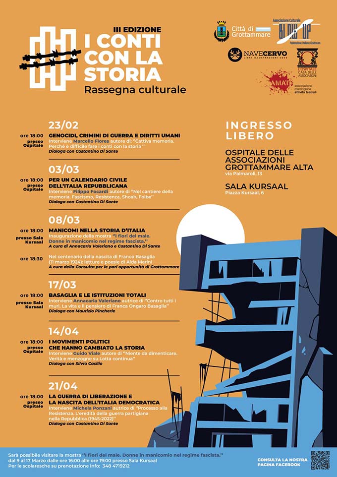 Tanti gli esperti attesi a Grottammare nel corso di una programmazione offerta anche alle scuole, invitate a visitare la mostra “I fiori del male. Donne in manicomio nel regime fascista”. L’esposizione sarà allestita dal 9 al 17 marzo nella Sala Kursaal (è possibile prenotare una visita al numero 348.4719212) e rappresenta l’occasione per ricordare il centenario della nascita del dott. Franco Basaglia (11 marzo 1924). Al tema della salute mentale saranno infatti dedicati due dei tre appuntamenti del mese di marzo: “Manicomi nella storia d’Italia (8 marzo) e “Basaglia e le istituzioni totali” (17 marzo). Il programma si chiuderà a pochi giorni dall’Anniversario della Liberazione, con la storica Michela Ponzani (21 aprile), docente eautrice di programmi per Rai Storia, che offrirà il suo contributo sulla guerra di liberazione e la nascita dell’Italia democratica.
