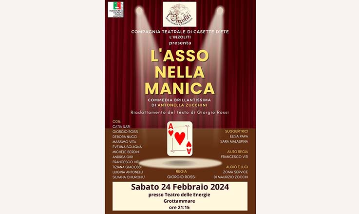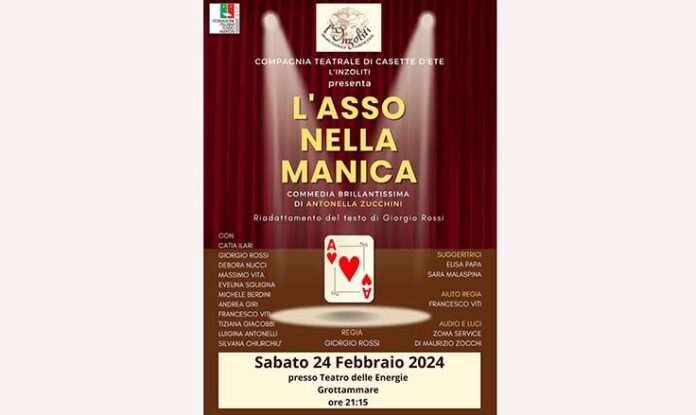 GROTTAMMARE – Sabato 24 febbraio alle ore 21,15 al Teatro delle Energie di Grottammare andrà in scena il secondo appuntamento della Rassegna di Teatro Amatoriale Dialettale “Commedie Nostre”. Sul palco la compagnia “Gruppo Teatrale L’Inzoliti” di Casette D’Ete con la brillantissima “L’asso nella manica” di Antonella Zucchini: una commedia in tre atti con riadattamento del testo e regia di Giorgio Rossi. La pièce è ambientata nel lontano 1959 e la famiglia Marinelli, oppressa dai debiti e da un paventato sfratto, spera in un asso nella manica. Tutto avviene mentre l’Italia intera aspetta con ansia la proclamazione del vincitore del nono festival di Sanremo. Sul palco gli attori Catia Ilari, Giorgio Rossi, Debora Nucci, Massimo Vita, Evelina Sguigna, Michele Berdini, Andrea Giri, Francesco Viti, Tiziana Giacobbi, Luigina Antonelli e Silvana Chiurchiù.