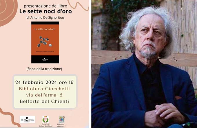 BELFORTE DEL CHIENTI – Ancora un incontro dedicato alle splendide fiabe dello scrittore e filosofo cuprense Antonio De Signoribus, tratte dall’ultimo libro “Le sette noci d’oro” (Seri Editore). L’incontro avrà luogo sabato 24 febbraio alle ore 16 nella Biblioteca Ciocchetti a Belforte del Chienti, in provincia di Macerata. Le fiabe di Antonio De Signoribus sono molto amate perchè sminano i cuori, incoraggiano ad affrontare la vita nel giusto modo, specialmente in questo triste periodo che stiamo vivendo. Il meraviglioso per il nostro filosofo e scrittore, nonché raffinato studioso e ricercatore, che è alla base del suo libro, si dipana attraverso la vicenda in modo che tutto si esprima concretamente nell’azione. Da rimarcare poi, la pregnanza simbolica cui riesce il dettato della fiaba. Un libro, insomma, tutto da scoprire dove si nota, per dirla con Calvino “la sostanza unitaria del tutto, uomini bestie piante cose, l’infinita possibilità di metamorfosi di ciò che esiste”.