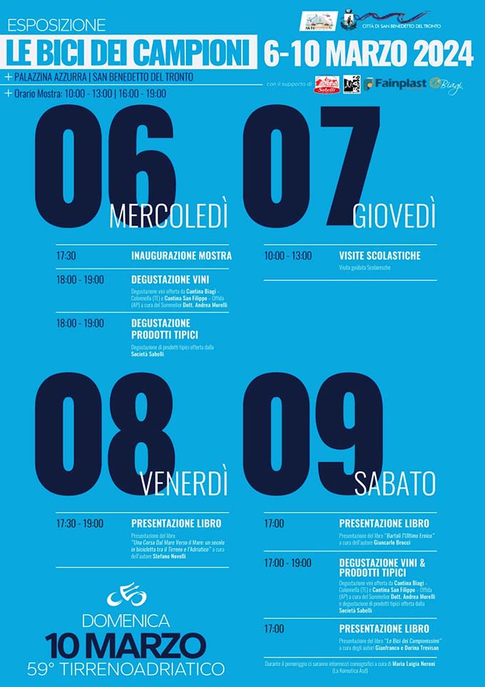 Mercoledì 6 marzo l’inaugurazione sarà impreziosita da degustazioni di vini offerti dalla Cantina Biagi di Colonnella e dalla Cantina San Filippo di Offida, con il coordinamento del sommelier Andrea Morelli e di prodotti tipici offerti dalla Sabelli Spa, giovedì mattina ci sarà spazio per le visite guidate di alcune scolaresche, venerdì alle ore 17.30 verrà presentato il libro “Una corsa dal mare verso il mare: un secolo di bicicletta tra il Tirreno e l’Adriatico” di Stefano Novelli, mentre sabato spazio ai volumi “Bartali, l’ultimo eroico”, presentato dall’autore Giancarlo Brocci e “Le bici dei campionissimi” a cura degli autori Gianfranco e Dorina Trevisan.