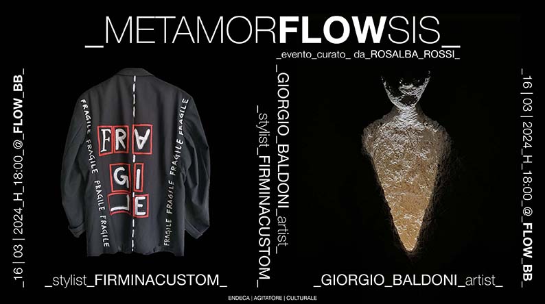 SAN BENEDETTO DEL TRONTO – “Metamorflowsis” è il titolo di una interessante esposizione di sculture d’arte e creazioni moda, evento estemporaneo promosso da Endeca Agitatore Culturale, a cura di Rosalba Rossi, che avrà luogo sabato 16 marzo alle ore 18 al Flow B&B (Via Alberico Gentili, 25) a San Benedetto del Tronto. Il tema? “Metamorflowsis” è una idea-evento che vuole far dialogare le opere dell’artista Giorgio Baldoni e le creazioni di Firminacustom. Entrambi si interrogano nell’incipit del sommo poema apuleiano “a narrar il mutar delle forme in corpi nuovi mi spinge l’estro”, e i due artisti si spingono ad indagare tutto ciò che dinanzi a loro è in costante flusso, transitorio, caduco, impermanente. In metamorfosi. In un luogo nuovo, diverso, non deputato ad ospitare eventi d’arte, le opere di Giorgio Baldoni e le creazioni di Firminacustom fluttuano dialogando e sfidando uno spazio non più fisico, ma mentale. Collocate nei tre piani della struttura ricettiva del Flow B&B, saranno percepite e percettibili alla curiosità di ciascuno secondo un flusso di coscienza lento o veloce o totalmente assente, cercando di restituire comunque una visione dell’umanità, della sua fragilità, ricordandoci che siamo frutto di metamorfosi, la vita stessa lo è, come qualsiasi altra forma di vita non è altro che la trasformazione di una che l’ha preceduta e prepara ad altre vite. Busti vuoti e giacche asimmetriche per una volumetria carnale e passionale, per una incompletezza ed una fragilità sempre presenti. Trascendenza ed immanenza legano le creazioni dei due artisti, in forme dirette ed immediate. I teli, le sedie, i revers delle giacche sapientemente interpretati sono narrazioni aperte affinché il visitatore possa e voglia indagare, ricercare, ricostruire la propria personale trasformazione. Un’esperienza immersiva che scardina struttura e paradigmi mentali e ci offre un mezzo di espressione artistica, che è soprattutto interpretazione del mondo contemporaneo del suo vissuto e capacità di superare ruoli tradizionali, trasformandolo in un veicolo di riflessione culturale, sociale, ambientale. In questo perenne divenire, nel flusso delle trasformazioni le opere di Giorgio Baldoni e le creazioni di Firminacustom ci mettono in guardia, ci pungolano, ci fanno pensare che la parola Arte in greco non esiste, ma era la téchne, ossia la capacità di capire come si fa a fare una cosa in maniera tale che sia agathos, ossia buona, utile. Non è quindi la bellezza che salverà il mondo, semmai è proprio l’opposto. Il nostro compito è di salvare la bellezza.