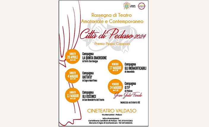 PEDASO – Novità nel panorama dell’amatorialità picena presso il CineTeatro di Pedaso, con una neo rassegna dedicata al talento e alla passione dell’arte teatrale dialettale e contemporanea. La kermesse organizzata dalla Città di Pedaso e dall’Associazione Artistic Picenum prevede ben cinque appuntamenti serali, dal 20 aprile al 24 maggio, che promettono entusiasmo e sana vivacità. Ecco le compagnie in scena e il calendario dell’iniziativa: sabato 20 aprile Compagnia “La Quinta Dimensione” di Porto San Giorgio, sabato 4 maggio Compagnia “Rattattù” di Cupra Marittima, sabato 11 maggio la Compagnia O’Scenici di San Benedetto del Tronto, venerdì 17 maggio la Compagnia “Gli Indimenticabili” di Amandola, infine venerdì 24 maggio la serata di gala finale a cura del Gruppo Teatrale Pedaso. Giuseppe Cameli, presidente dell’Artistic Picenum, dichiara:« Saranno cinque appuntamenti dedicati alle produzioni locali indipendenti, con ben 110 attori amatoriali protagonisti. Ringraziamo la famiglia Capponi per aver aderito all’iniziativa, omaggio alla memoria di un indimenticabile pioniere del teatro locale e all’Amministrazione comunale pedasina per la fiducia». Info e prenotazioni presso Merceria il Cigno di Grottammare e Cartolibreria Camillettis di Pedaso. Infoline: 3475406630.