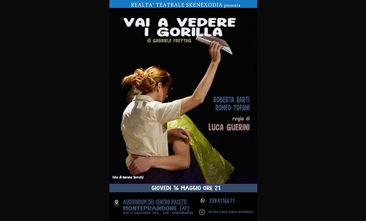 MONTEPRANDONE – Dopo l’ultimo successo romano torna nelle Marche, più precisamente giovedì 16 maggio alle ore 21, presso l’Auditorium Pacetti di Monteprandone lo spettacolo “Vai a vedere i gorilla” di Gabriele Freytag. Chi è l’ultimo paziente della psicoterapeuta? Perché lei lo definisce “il caso più complicato della sua carriera”? Da queste due domande si muove un thriller psicologico ricco di sentimenti e sorprese che trascina lo spettatore ad osservare la stanza della terapia smascherando clichè e luoghi comuni. Romeo Tofani e Roberta Sarti sono i protagonisti sul palco di questa vicenda emozionante che riescono con la propria interpretazione a dare corpo a due personaggi complessi, incapaci a raccontarsi e chiudere i propri conti con il passato. «Ho riallestito questo testo – dichiara il regista Luca Guerini – dopo il successo ottenuto lo scorso anno perché affronta una tematica molto importante che può avere risvolti importanti anche in termini sociali. Ringrazio sicuramente Gabriele per avermi affidato questo gioiello e per la libertà di “farlo mio”, e gli attori che hanno dato corpo ai due personaggi per come io, da lettore, li avevo immaginati». La Realtà Teatrale Skenexodia è una produzione indipendente fondata da Guerini nel 2004, da allora ha realizzato ben 118 allestimenti diversi. In quest’anno la stagione invernale ha contato 78 date in 29 comuni diversi, impegnando con 18 produzioni ben 36 attori professionisti regolarmente assunti. Dirige rassegne teatrali a Milano, Ancona, Jesi, Senigallia, Itri, Fossombrone, Riccione e Falconara Marittima. Per prenotazioni è possibile rivolgersi al 3384116671 (solo whp).