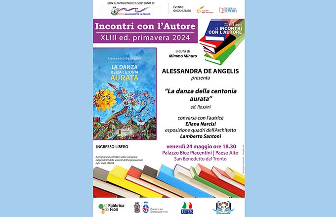 SAN BENEDETTO DEL TRONTO – “La danza della centonia aurata” è il titolo del libro che Alessandra De Angelis presenterà venerdi 24 maggio, alle ore 18.30, al Palazzo Bice Piacentini, Paese Alto di San Benedetto. A conversare con l’autrice sarà Eliana Narcisi. Alessandra De Angelis, classe 1972, lavora come segretaria commerciale per un agente di zona della casa editrice milanese FME Education Spa. Nel 2017 esordisce come scrittrice con “Magiche metamorfosi”, romanzo di formazione che ha partecipato all’edizione 2018 del Premio Campiello, al primo Festival Inchiostro Marchigiano nonché alla Fiera Più Libri più liberi e al Salone del libro di Torino. Autrice di racconti pubblicati in varie antologie e raccolte, ha girato un video da Marzullo in Rai per il programma televisivo “Mille e un libro”.