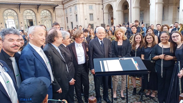 FERMO – Il 2 giugno nel cortile d’onore del Palazzo del Quirinale, alla presenza del Capo dello Stato Sergio Mattarella, si è esibita la Jam Orchestra Giovanile di Fiati dell’Anbima, associazione nazionalebande musicali sezione Marche diretta dal M° Michele Mangani. L’esibizione ha visto la partecipazione di un nutrito gruppo di strumentisti provenienti dal Conservatorio “G.B.Pergolesi” di Fermo ed in particolare: Michele Andrenacci Michele, Liang Qu, Filippo Cognigni, Valentino Capri, Arianna Pallotta Arianna, Alessandro Azzurro, alunni del M° Luca Cognigni; Vincenzo Scavuzzo, Maria Elisa Palermi, alunni del M° Rinaldo Strappati; Davide Formentini alunno del M° Teresa Spagnuolo; Lorenzo Passamonti alunno del M° Lucy Edna Derosier; Sofia Maria Luciani alunna del M° Giampaolo Antongirolami; Andrea Mancuso alunno del M° Massimo Mazzoni. L’esibizione, molto apprezzata dal Capo dello Stato e dai rappresentanti istituzionali, ancora una volta mette in risalto la presenza sul territorio dell’istituzione universitaria musicale e l’importanza del buon rapporto che intercorre tra la stessa e l’ambiente delle Bande Musicali, da cui provengono molti studenti del Conservatorio Pergolesi. L’auspicio è che si crei sempre più un rapporto di crescita tra le due entità culturali per incentivare chi inizia lostudio dello strumento in Banda per diletto e nel tempo vuole trasformarlo in una attività professionalmente valida.