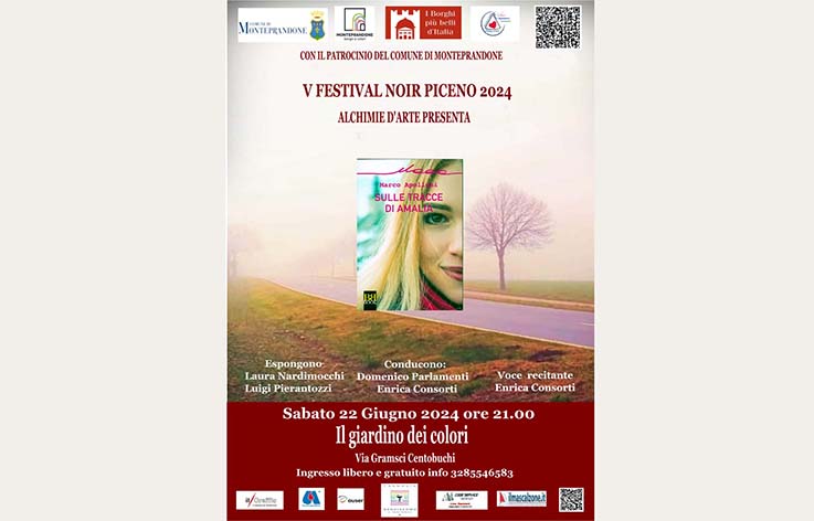 MONTEPRANDONE – Quarto appuntamento per il  Festival Noir Piceno 2024, evento a cura dell’associazione Alchimie d’Arte con il patrocinio del Comune di Monteprandone e la collaborazione di Avis Monteprandone, Auser insieme Monteprandone con gli sponsor Farmacia San Giacomo e Code Service. Ospite della serata di sabato 22 giugno – alle ore 21 presso “Il Giardino dei colori” di Via Gramsci a Centobuchi – sarà Marco Apolloni, per la prima volta a Centobuchi per presentare il sio libro dal titolo “Sulle tracce di Amalia” (Bibibook edizioni). L’evento sarà condotto da Domenico Parlamenti ed Enrica Consorti che sarà anche la voce recitante. Gli artisti che esporranno nel corso della serata sono Laura Nardinocchi e Luigi Pierantozzi. L’ingresso è libero e gratuito. Info: 3285546583.