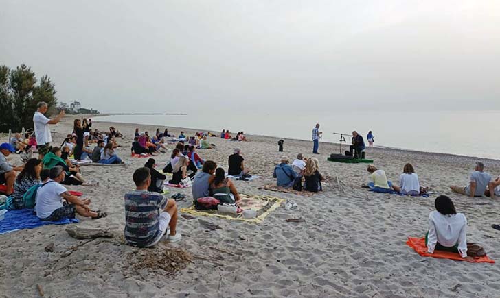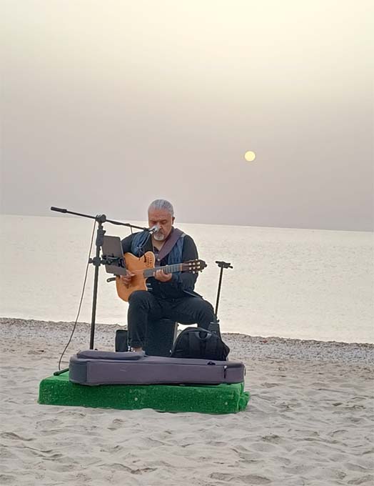 SAN BENEDETTO DEL TRONTO – Nonostante l’orario impegnativo, sono state decine le persone che alle prime luci dell’alba si sono radunate sulla spiaggia antistante la Torre sul Porto, nella Riserva Naturale Sentina, in occasione del concerto all’alba del Solstizio d’estate, tenutosi nella mattinata del 20 giugno. Un successo al quale ha contribuito anche il bel tempo, che ha permesso ai partecipanti di godere a pieno del sorgere del sole sull’orizzonte del mare. Il tutto accompagnato dalle note di Martin Diaz Gonzales, artista argentino di fama internazionale, che si è esibito con la sua chitarra acustica portando per l’occasione una selezione di brani tra i più noti e acclamati del suo repertorio.