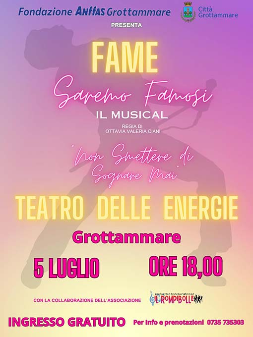 GROTTAMMARE – La Fondazione Anffas di Grottammare presenta il nuovo spettacolo teatrale “Fame, Saremo Famosi – Il Musical” che andrà in scena venerdì 5 luglio, alle ore 18, presso il Teatro delle Energie. Gli interpreti, dopo mesi di impegno e prove, non vedono l’ora di salire sul palco per far trascorrere ai presenti un pomeriggio di divertimento. Guidati da Ottavia Valeria Ciani, musicoterapista della struttura, i ragazzi racconteranno sul palco la storia di una compagnia teatrale di “scalcagnati” che si ritrova a provare tutti i giorni in un vecchio teatro. Non hanno soldi per mettere in scena uno spettacolo, ma hanno mille sogni nel cassetto e non vogliono mai smettere di sognare. Dive vanitose, attori assonnati ed eterni sognatori rallegreranno il pubblico con canti e coreografie tratti dai più famoli musical. Riusciranno a diventare famosi? Staremo a vedere. Faranno parte dello spettacolo più di 20 ragazzi ospiti delle Comunità di Grottammare e Ripatransone, dell’appartamento L.112- Vita indipendente, del centro diurno socio riabilitativo e alcuni ragazzi che frequentano il corso di teatro musical come esterni. Gli organizzatori rivolgono un ringraziamento a Paola e Pasqualino dell’associazione culturale musicale “Il Rompibolle” per la loro disponibilità e per il loro supporto. L’ingresso allo spettacolo è gratuito.