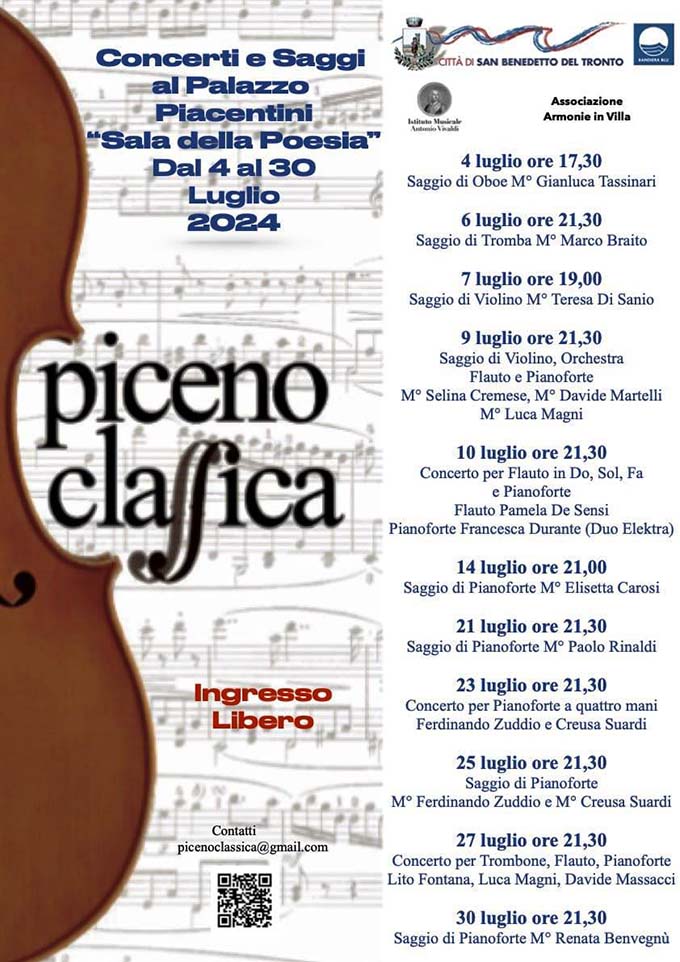 SAN BENEDETTO DEL TRONTO – Inizia mercoledì 3 luglio con un concerto serale all’Osteria “Pane e Vino” di Pietro Lilla, “Piceno Classica”, una serie di Masterclass di musica classica con docenti provenienti da tutta Italia, che saranno contornate da concerti dei maestri e degli allievi offerti alla città in diverse ambientazioni. La Sala della Poesia di Palazzo Piacentini e vari locali del centro cittadino risuoneranno per l’intero mese di luglio di buona musica nel ricordo di Daniela Tremaroli (violoncellista e storico direttore dell’Istituto Vivaldi) che aveva sempre promosso e sostenuto questa manifestazione. «Trovo che questa iniziativa – ha detto il noto ristoratore Pietro Lilla – sia molto importante per la nostra città, in quanto regala diverse occasioni culturali a chi, cittadini e turisti, abbia voglia di trascorrere del tempo libero ascoltando della buona musica. Secondo me – ha concluso – è un’iniziativa che dovrebbe durare per tutto l’anno, magari con la collaborazione delle attività commerciali del centro, nelle quali si fonderebbero ottimamente musica classica, commercio ed enogastronomia». La versione 2024 di “Piceno Classica” è un’idea del maestro Luca Magni ed è organizzata dall’associazione “Armonie in Villa” di Pistoia e dal maestro Lito Fontana con il patrocinio del comune di San Benedetto e la collaborazione dell’Istituto Musicale “Antonio Vivaldi”. I primi concerti di questa rassegna, che saranno ospitati nella Sala della Poesia di Palazzo Piacentini, al Paese Alto (tutti con ingresso gratuito) si terranno giovedì 4 luglio alle ore 17.30 quando il maestro Gianluca Tassinari terrà un saggio di oboe, per proseguire sabato 6 luglio alle ore 21.30 (saggio di tromba del maestro Marco Braito) e domenica 7 luglio alle ore 19 con il saggio di violino del maestro Teresa Di Sanio. Il programma completo dei concerti dei vari maestri è disponibile all’indirizzo https://turismo.comunesbt.it/en/event/festival-piceno-classica-2024/.