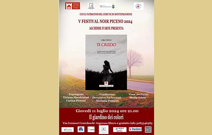 MONTEPRANDONE – Sesto e ultimo appuntamento per il 5° Festival Noir Piceno 2024 con Ciro Pinto che torna ancora una volta a Centobuchi dove, giovedì 11 luglio alle ore 21, presso “Il Giardino dei colori” di Via Gramsci, presenterà la sua ultima opera dal titolo “Ti credo” (Tra le righe edizioni). L’evento è a cura dell’associazione Alchimie d’Arte con il patrocinio del Comune di Monteprandone e la collaborazione di Avis Monteprandone, Auser insieme Monteprandone con gli sponsor Farmacia San Giacomo e Code Service. A condurre la serata Domenico Parlamenti e Stefania Pompeo, voce recitante Maria Trizio. Gli artisti che esporranno sono Tiziana Marchionni e Carina Pieroni. L’ingresso è libero e gratuito. Info: 3285546583.