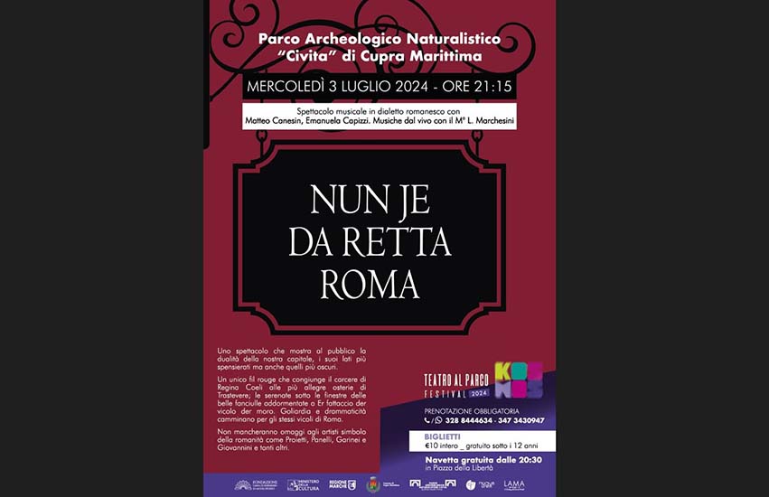 CUPRA MARITTIMA – Dopo il grande successo del primo appuntamento di Teatro al Parco Festival, presso il Parco Archeologico Civita di Cupra Marittima, torna la Rassegna Kosmos con “Nun je da retta Roma!”. Questa volta la magica cornice storica del Parco ospiterà uno spettacolo tutto da ridere, dove l’irriverente comicità romana è accompagnata da musica dal vivo, per portare un angolo della Capitale sulla costa marchigiana. In scena Matteo Canesin, Manuela Capizzi e il Maestro Lorenzo Marchesini, trio consolidato, che ha già conquistato i teatri a nord delle Marche e ora arriva a Cupra Marittima con il suo modo di fare spontaneo, pronto a raccontare la Roma dei grandi comici e non solo. Il repertorio dei più grandi artisti romani, tra cui Paolo Pannelli, Enzo Garinei e Gigi Proietti incontra l’altra faccia di Roma, quella de Er fattaccio der vicolo del moro.