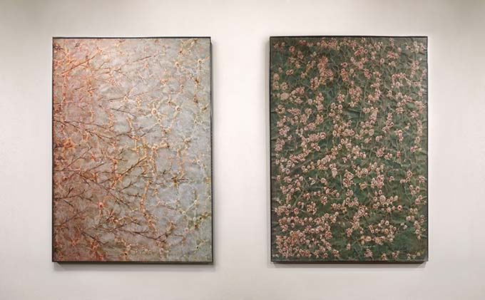 La curatela della mostra, patrocinata dal Comune di Recanati, è stata affidata a Giorgio d’Orazio, curatore indipendente legato in particolare alla figura di Joseph Beuys, il Maestro della Difesa della Natura. Sono 13 i “dittici” esposti, ovvero coppie di opere di dimensione 70×100 cm, incorniciate in metallo, dal valore cromaticamente evocativo e in dialogo fra loro; un corpus di lavori che determina un’impaginazione visuale dello spazio, complice anche un particolare allestimento, capace di suggestionare per varietà e potenzialità visiva: dimensioni aniconiche in cui lo sguardo può interrogarsi sulla percezione di una reale evidenza quanto del celato dalla realtà dell’opera.