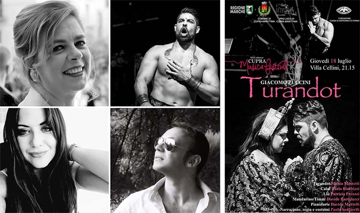 CUPRA MARITTIMA – La bellissima favola di Turandot resa immortale dal grande Giacomo Puccini – raccontata dal musicologo regista Paolo Santarelli – rivivrà giovedì 18 luglio alle ore 21.15 nella stupenda cornice di Villa Cellini a Cupra Marittima per l’apertura della XXII edizione del “Cupra Musica Festival” in collaborazione con il Comune e la Proloco di Cupramarittima. Grande attesa per la protagonista dell’opera il soprano Monia Massetti, esperta nel ruolo che interpreta con voce possente, sfoggiando acuti strabilianti, con fraseggio incisivo, cesellato sulla parola scenica, che questo ruolo esige. Timur e Mandarino sono impersonati da Davide Bartolucci artista poliedrico dalla voce generosa, Patrizia Perozzi nel dolcissimo ruolo di Liù, rivale in amore di Turandot, che sacrifica la vita per amore di Calaf, intepretato dal tenore drammatico Dario Ricchizzi, dalla voce brunita e nel contempo romantica, che interpreterà il celebre “Nessun dorma”. Il maestro concertatore al pianoforte sarà il direttore artistico del festival Davide Martelli.Tutti gli artisti indosseranno costumi teatrali della collezione privata della Compagnia Lirica “Incontri d’Opera” di Fermo. Ingresso con prenotazione a 2 euro presso l’ufficio Iat in piazza della Libertà 11. Contatti telefonici: 0735779193/ 3534106942.