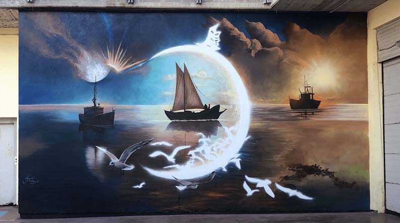 SAN BENEDETTO DEL TRONTO – Con l’apposizione della firma dell’artista sull’opera si è conclusa nei giorni scorsi la realizzazione del terzo murale che adorna le pareti del Mercato Ittico all’Ingrosso, avviata in occasione dello svolgimento del 28° Festival dell’Arte sul Mare, tenutosi lo scorso mese di giugno. Realizzata da William Kaine, artista sambenedettese le cui opere si possono ammirare in diversi angoli della città, il murale misura 30 metri quadrati e raffigura due imbarcazioni da pesca contemporanee e una lancetta che solcano il mare sotto un cielo notturno che si approssima all’alba. Kaine non è nuovo alla realizzazione di opere, anche imponenti, sui muri della città: sono infatti ben noti i suoi lavori al parco “Wojtyla”, dove ha realizzato un murale dedicato alla vita di Giovanni Paolo II, e sulla facciata sud della chiesa di Sant’Antonio da Padova, dove campeggia un’opera che raffigura il Santo a cui è intitolato l’edificio religioso. In tempi più recenti, l’artista ha realizzato altri due murali sugli spazi sottostanti le scalinate del Mercato Ittico, sempre con opere a tema marinaro. La partecipazione del Mercato Ittico all’Ingrosso come spazio all’interno del Festival dell’Arte sul Mare apre alla possibilità che lo stesso diventi una tappa fissa della kermesse artistica estiva, ampliando così l’estensione non solo della manifestazione stessa, ma anche del museo a cielo aperto del MAM che andrebbe così ad abbracciare simbolicamente l’intera area portuale.