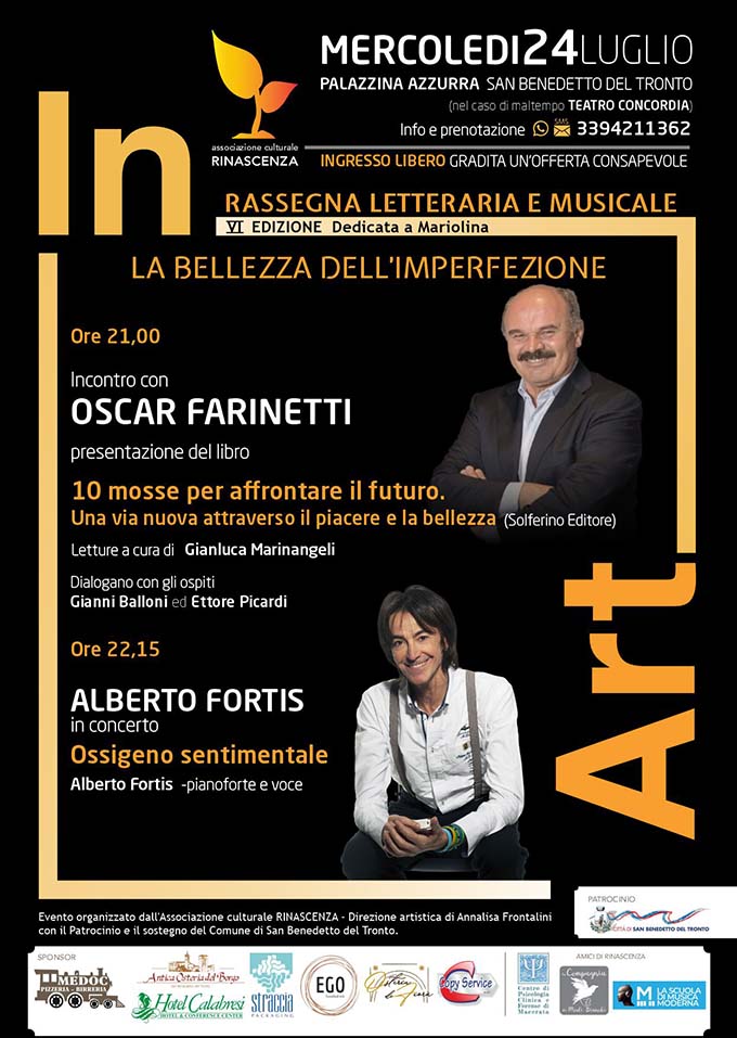 SAN BENEDETTO DEL TRONTO – Prosegue la VI edizione della rassegna letteraria e musicale In Art, raffinata kermesse, organizzata dall’associazione culturale Rinascenza con la direzione artistica di Annalisa Frontalini. Appuntamento mercoledì 24 luglio alle ore  21 alla Palazzina Azzurra di San Benedetto del Tronto con una serata imperdibile sia per il tema sia per gli ospiti. La serata si intitola la “La bellezza dell’imperfezione” e vedrà susseguirsi sul palco Oscar Farinetti e Alberto Fortis. Oscar Farinetti alle 21 presenterà il suo ultimo libro “10 mosse per affrontare il futuro. Una via nuova attraverso il piacere e la bellezza” (Solferino Editore). Letture a cura dell’attore Gianluca Marinangeli. Dialogheranno con l’autore l’avvocato e poeta Gianni Balloni e il magistrato e poeta Ettore Picardi. La serata continuerà alle ore22.15con il cantautore e poeta Alberto Fortis (pianoforte e voce) nel concerto “Ossigeno sentimentale”. L’edizione 2024 di In Art è dedicata a Maria Morganti: Mariolina, amica luminosa, portatrice, amante e custode della Bellezza in ogni sua forma. L’ingresso è libero, è gradita un’offerta consapevole. Informazioni e prenotazioni dopo le ore 18 al numero 3394211362.