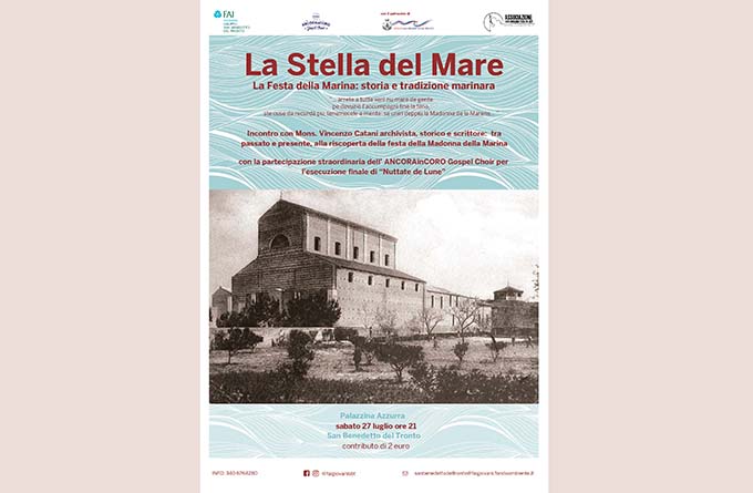 SAN BENEDETTO DEL TRONTO – La festa della Madonna della Marina è la “festa delle feste” di San Benedetto del Tronto. Ma quanti, oggi, soprattutto tra i più giovani, conoscono la storia e l’importanza di questa festa per i sambenedettesi? Proprio per riscoprire e mantenere viva questa importante tradizione cittadina il gruppo FAI Giovani San Benedetto del Tronto, in collaborazione con l’associazione “San Giovanni Paolo II Odv” e con il patrocinio del Comune di San Benedetto del Tronto, propone la serata “La Stella del Mare. La festa della Marina: storia e tradizione marinara”, che si terrà sabato 27 luglio alle ore 21.00 presso la Palazzina Azzurra di San Benedetto.