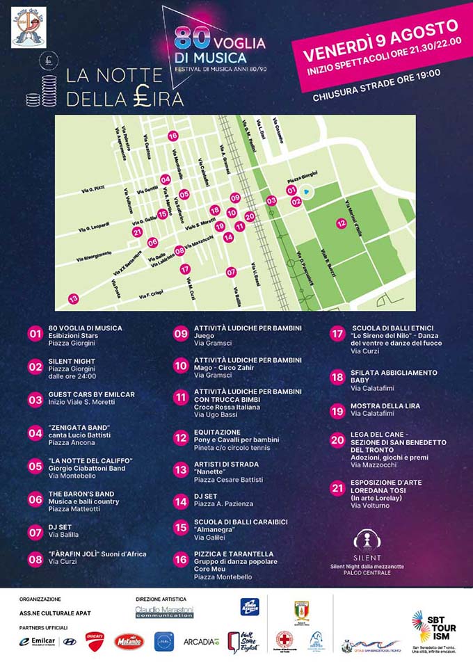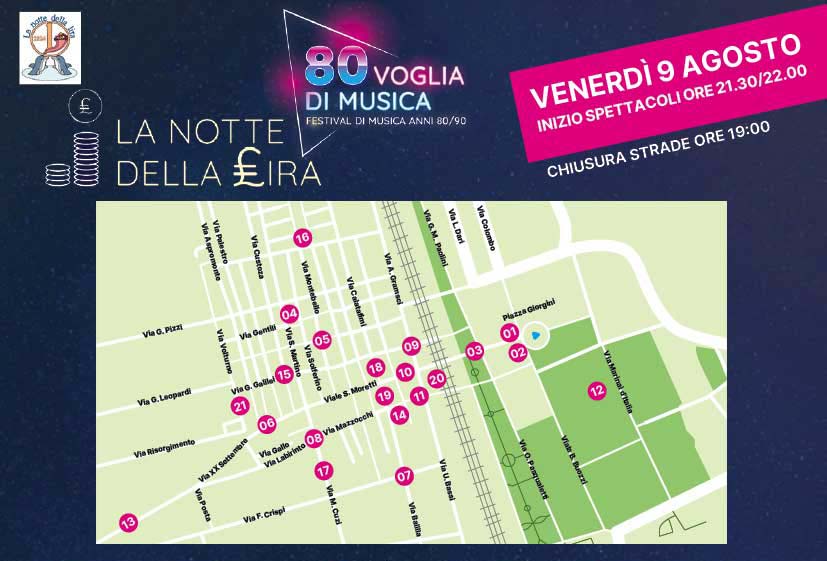 In contemporanea e fino a tardi, c’è la “Notte della Lira”che ha lo scopo di animare il centro ed esaltare tutte le piccole attività commerciali autonome che hanno lì la propria sede. Tantissimi i punti d’interesse, segnalati in tutte le vie e nei punti strategici da un programma dettagliato. Si esibiranno band come “Zenigata” con le cover di Battisti, “Giorgio Ciabattoni” con la notte del Califfo, “Country the Baron’s band”, gli etnici “FàrafinJolì” e due punti con Dj set, esposizione di auto a cura di EmilCar. E ancora Artisti di strada, balli caraibici con “Almanegra”, pizzica e tarantella col gruppo popolare “Core Meu” e danza del ventre con le “Sirene del Nilo”.